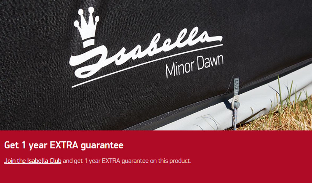 When you purchase the Isabella Minor Dawn from Yorkshire Caravans & Motorhomes, you also have the opportunity to enhance your ownership experience by joining the Isabella Club. As a member of the Isabella Club, you'll receive an additional 1-year guarantee on your new awning, giving you extra peace of mind. This extended guarantee reflects Isabella's confidence in the superior quality and durability of their products. Joining the Isabella Club is simple and provides long-term value, making your purchase of the Minor Dawn even more rewarding.